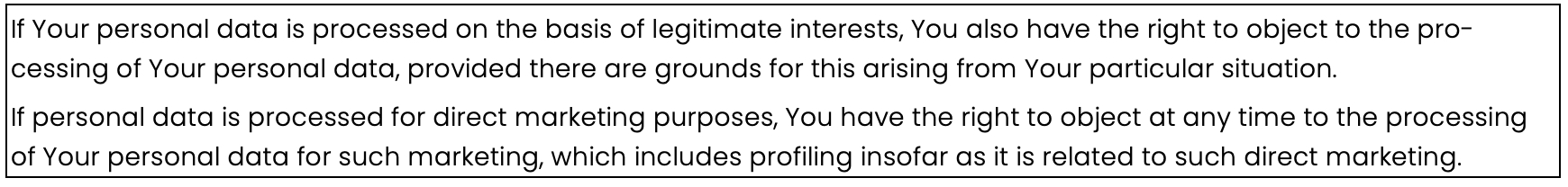 9.2. You can request information about Your personal data as processed by us. In particular, You can request information about the purposes of processing, the category of personal data, the categories of recipients to whom Your data was or will be disclosed, the planned storage period, the existence of a right to rectification, erasure, restriction of processing or objection, the existence of a right to lodge a complaint, the source of Your data if it was not collected directly from You, and the existence of automated decision-making including profiling and, if necessary, meaningful information on the details of the same.