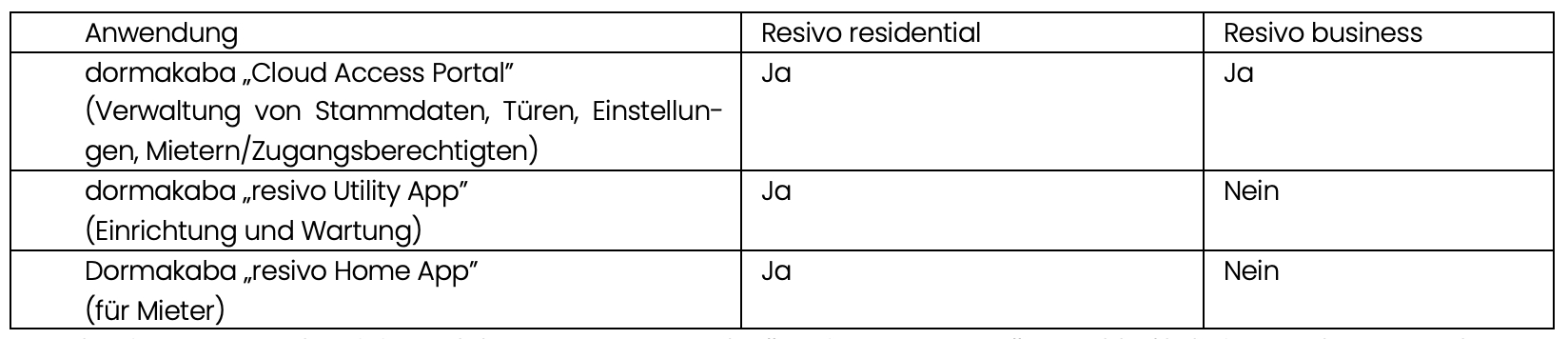 Das Cloud Access Portal und die mobilen Apps „resivo Utility” und „resivo Home”, einschließlich der zugehörigen Dokumentation und Updates, sind Bestandteile des dormakaba resivo SaaS-Dienstes und werden einzeln und zusammen auch als „Dienst” bezeichnet.